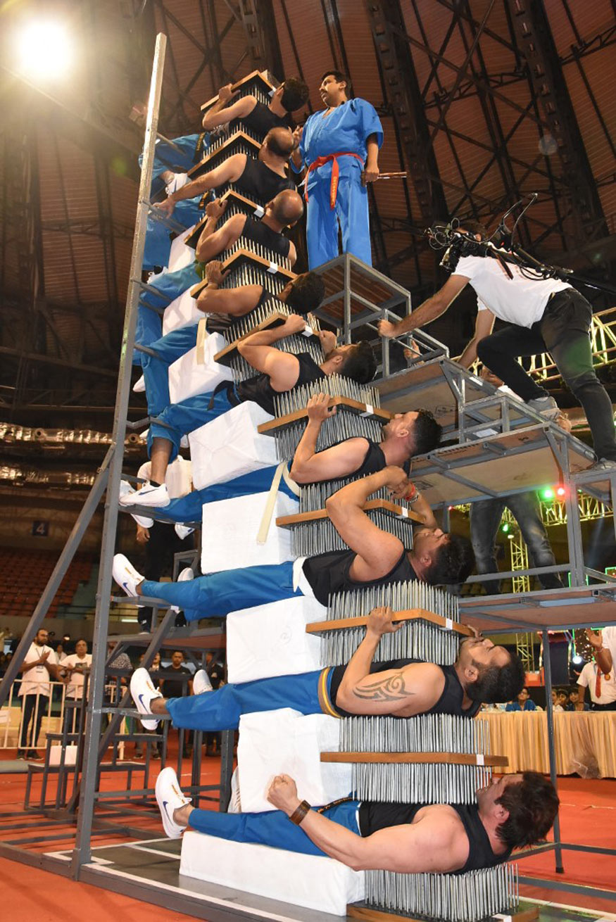 Специалист по боевым искусствам Виспи Харади (внизу) и члены его команды исполняют сэндвич из девяти слоев гвоздей в Сурате, примерно в 270 км от Ахмедабада, 23 октября 2019 года, пытаясь попасть в Книгу рекордов Гиннеса за самую многослойную кровать из гвоздей. бутерброд с гвоздями (1 дюйм). Виспи Харади и члены его команды установили новые рекорды Гиннеса в отношении самого многослойного сэндвича с гвоздями (1 дюйм). (Изображение: AFP)