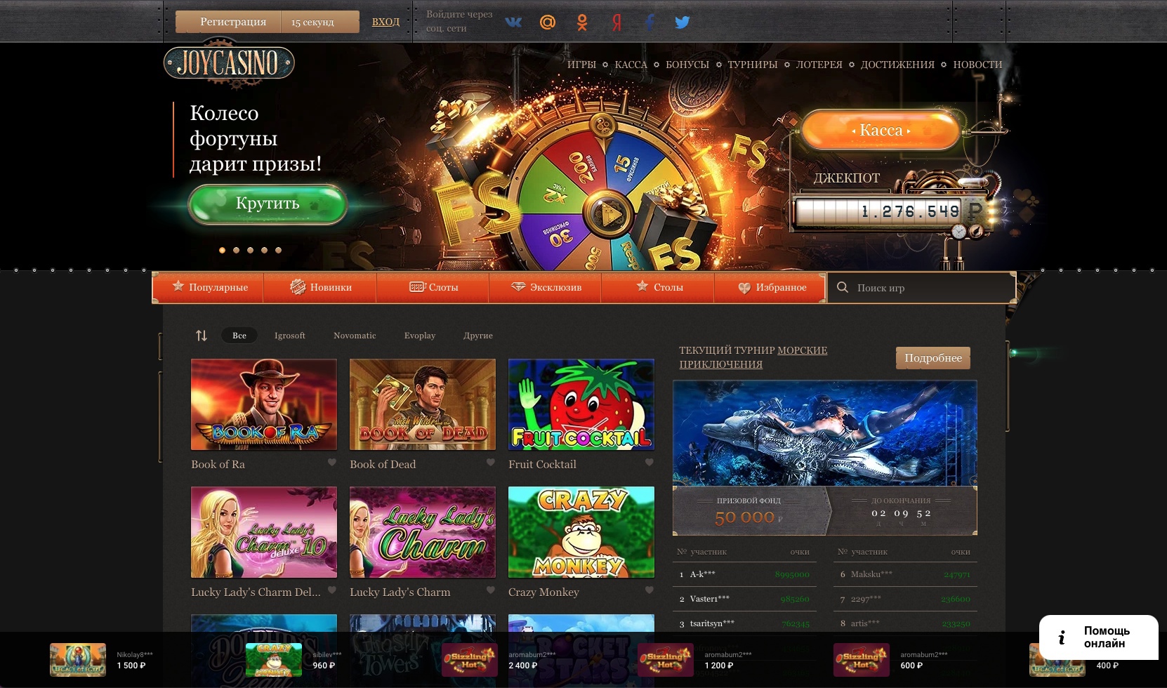 Joycasino — это новое и увлекательное место, где можно поиграть в свои любимые игры казино. Домашняя страница яркая, веселая и гостеприимная, и здесь все будет «в порядке» с вашими игровыми впечатлениями. Казино предлагает множество игр и многое другое. Откройте для себя новую вкладку «Спорт», где вы можете делать ставки на свои любимые команды и матчи, а также вкладку «Виртуальный спорт» для еще большего разнообразия. Существует огромный выбор игровых автоматов и настольных игр, а также специальная вкладка в реальном времени для игроков, которым нужен индивидуальный и интерактивный подход.