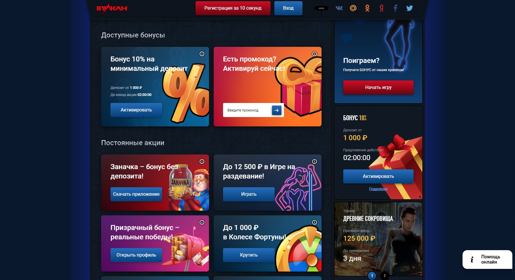 Первое, что мы заметили в казино Клуб Вулкан, — это фантастическая схема продвижения. Несмотря на то, что этот оператор — новый ребенок, этот оператор составил целый список бонусов, включая здоровенный приветственный бонус, кэшбэк, бонусы за пополнение счета, а также ежедневные выпадения и выигрыши.