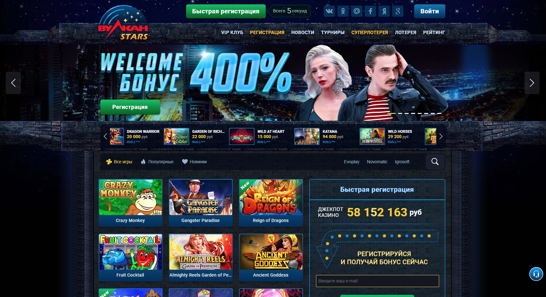 - Как только вы попадете на главную страницу казино Вулкан Старс, вам следует нажать синюю кнопку « Зарегистрироваться» на боковой панели.