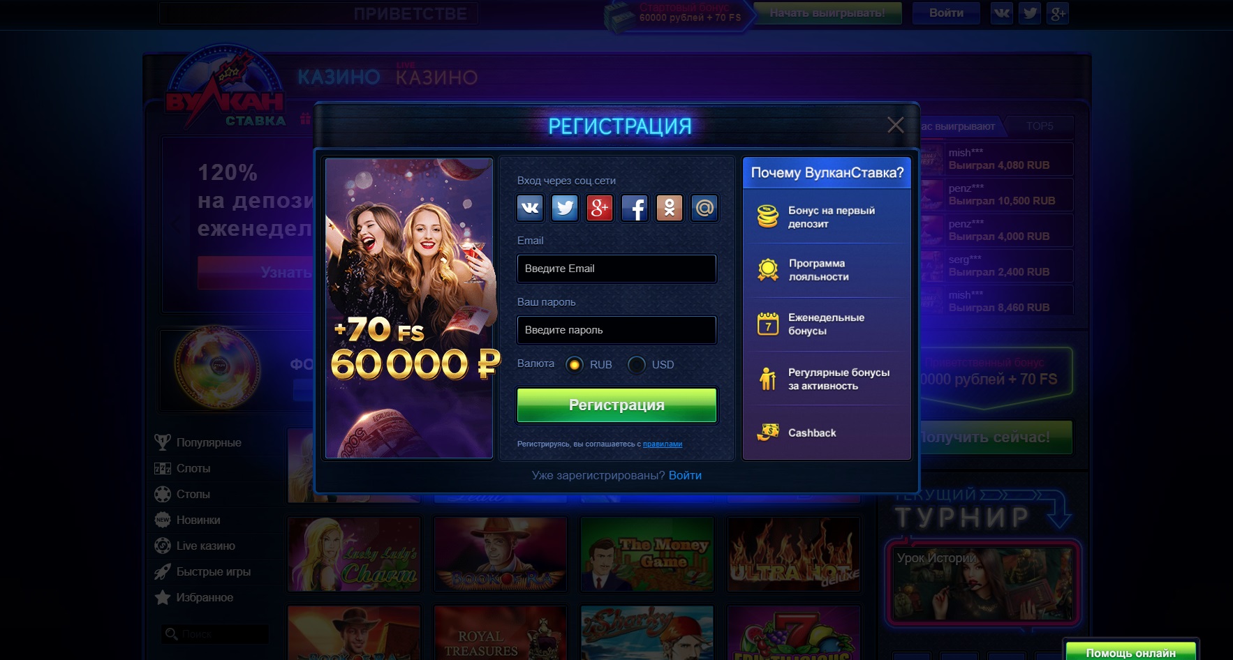 Регистрация в казино Вулкан Ставка