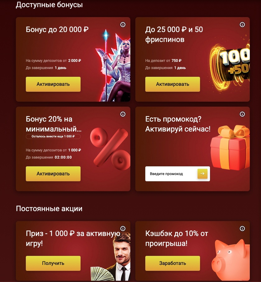 Игроки казино из РФ, а также все другие пользователи из других стран имеют доступ к бонусам, как с депозитом, так и без него. Игроки могут найти подробную информацию о текущих предложениях в разделе «Акции». После завершения регистрации каждый игрок получает бездепозитный бонус фриспинами. Получите бесплатный бонус 60 бездепозитных спинов, выполнив следующие простые шаги: