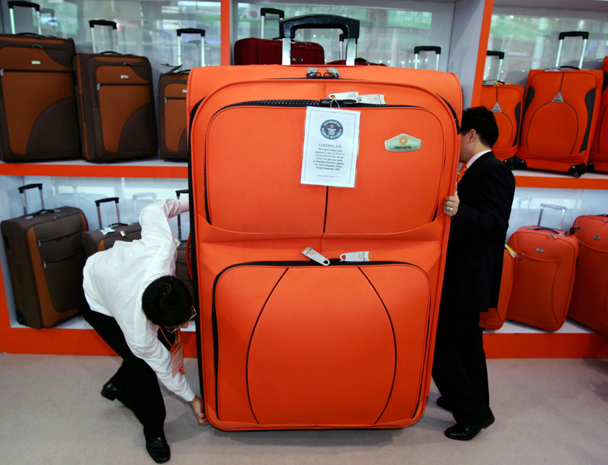 Этот чемодан для тележки был сертифицирован как самый большой в мире в Книге рекордов Гиннеса и имеет размеры 175 см (5 футов 9 дюймов) на 115 см (3 фута 9,3 дюйма) на 46 см (1 фут 6,1 дюйма) в толщину.