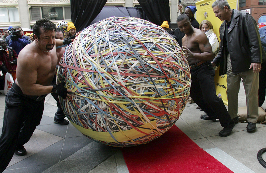 Рабочие катят мяч с резиновой лентой к весам для подтверждения веса во время официального взвешивания Книги рекордов Гиннеса в Чикаго. Мяч весом 4594 фунта (2084 кг) побил предыдущий рекорд в 3120 фунтов.