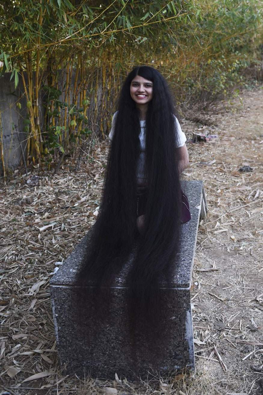 17-летняя Ниланши Патель, занесенная в Книгу рекордов Гиннеса 2019 года за самые длинные волосы в категории подростков, 190 см, позирует для фотографии в городе Модаса, примерно в 110 км от Ахмедабада, 19 января 2020 года. Патель был награжден премией. Рекорд Гиннеса 2019 года по самой длинной прическе 190 см в категории подростков. В 2018 году она установила Книгу рекордов Гиннеса в той же категории — 170,5 см. (Изображение: AFP)