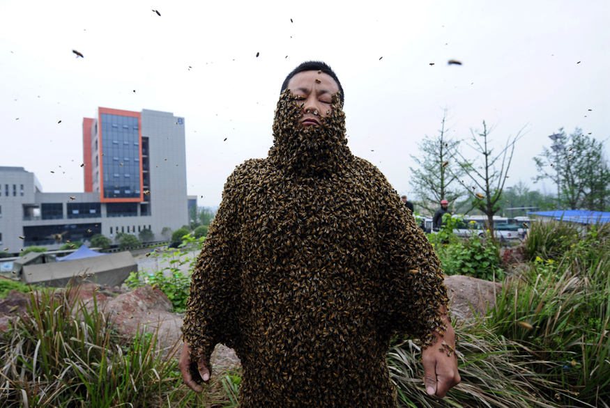 Пчеловод Ше Пинг покрыт пчелами во время попытки побить мировой рекорд в муниципалитете Чунцин. 32-летний Ше Пин побил мировой рекорд в среду, накрыв свое тело 33,1 кг пчел (около 331 000 пчел), побив последний мировой рекорд в 26,8 кг пчел, который был поставлен пчеловодом провинции Цзянси Руан Лянмин в 2008 году. сообщили СМИ.